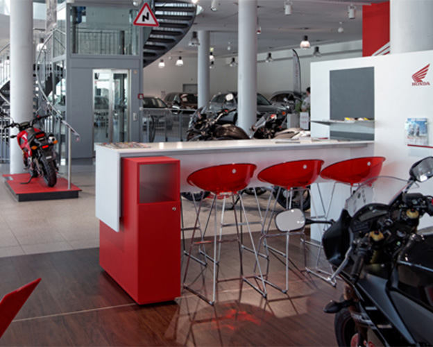 Umbau eines Hybrid Händlers für Auto und Motorrad in Frankfurt, auf Grundlage der CI Entwicklung in Zusammenarbeit mit der Firma Hakuhodo.