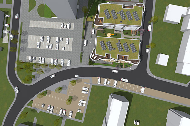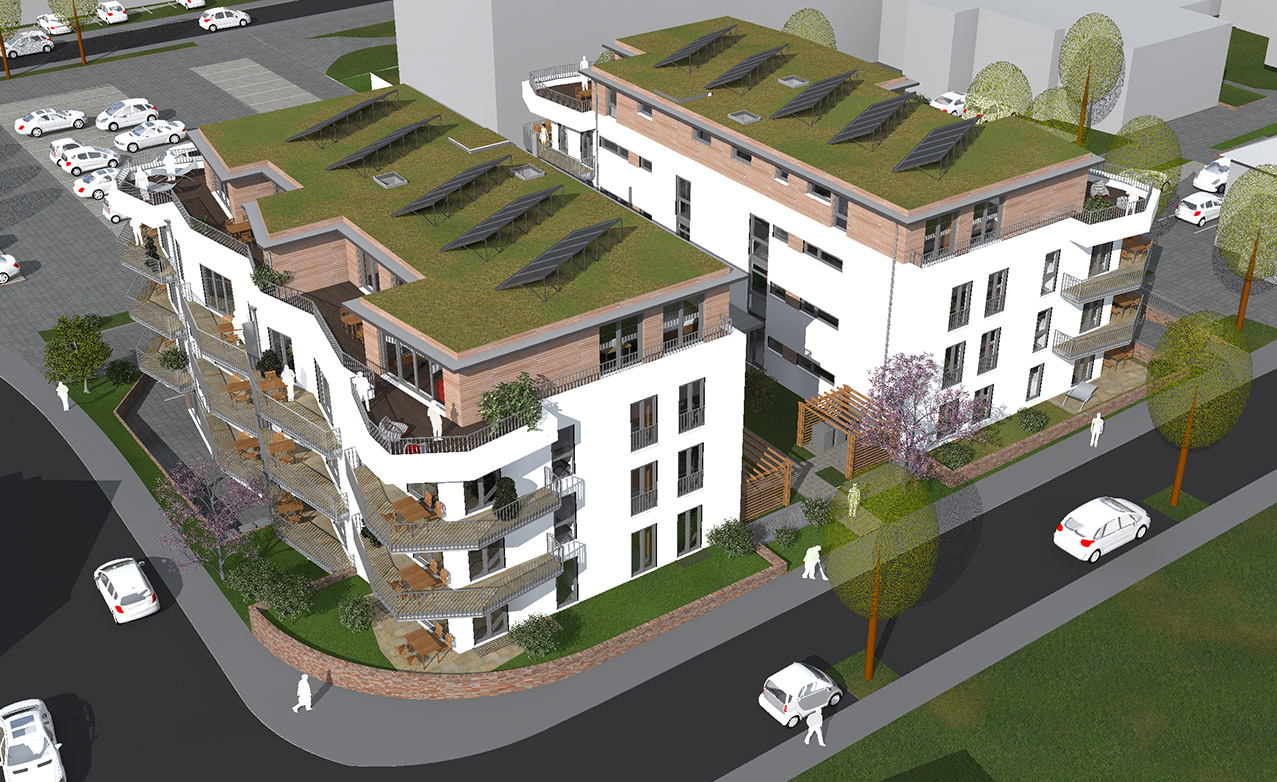 Die Planung der beiden Mehrfamilienhäuser inmitten von Steinbach am Taunus vereint klassische Wohnungsgrundrisse mit moderner Fassadengestaltung. Vor- und Rücksprünge in der Hauptfassade und den Balkonen bringen spannende und erlebbare Innen- und Außenräume. In den beiden Untergeschossen sind Tiefgaragenstellplätze und zwei Gewerbeeinheiten geplant, die sich zu dem vorhandenen, angrenzenden Platz öffnen.